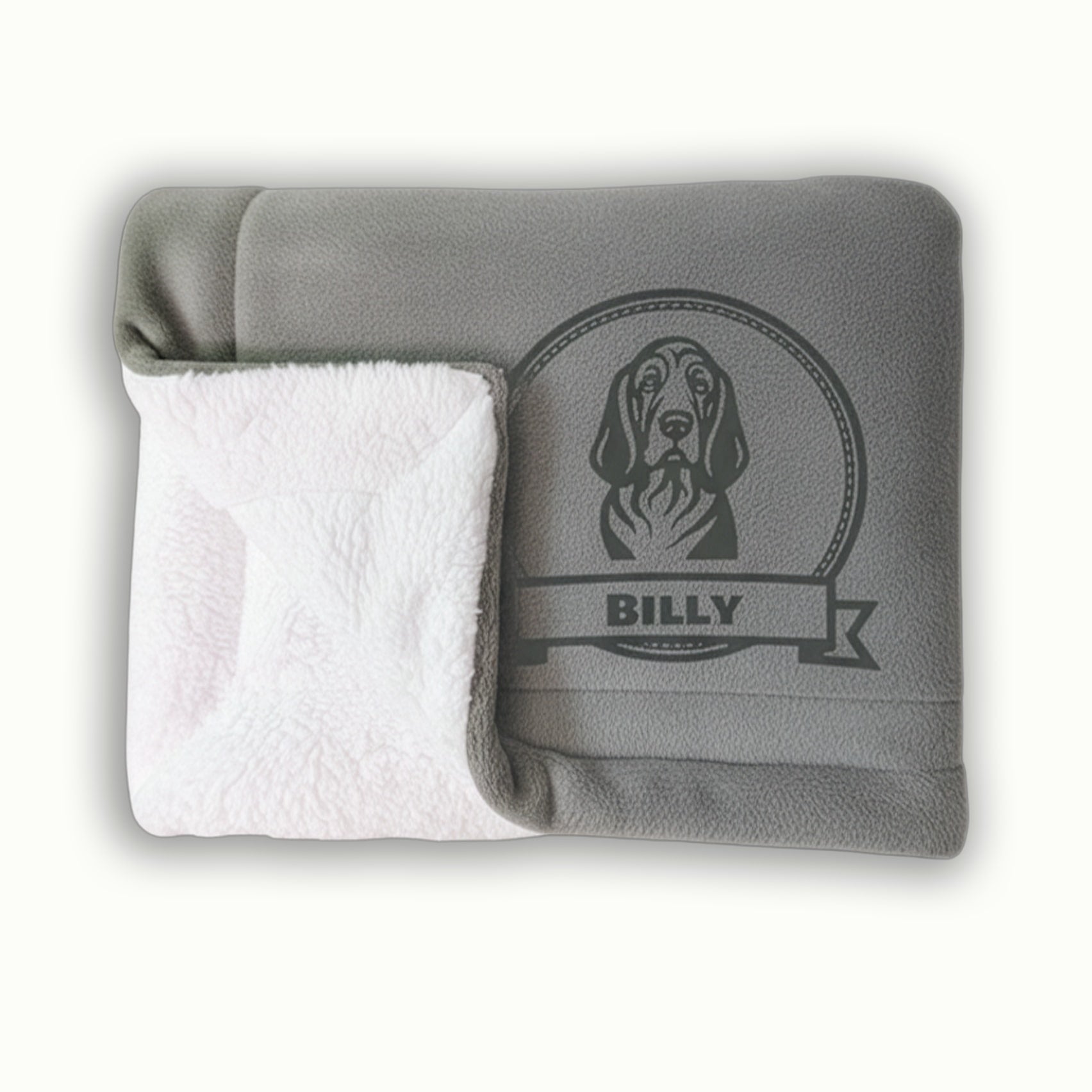Soft polar fleece mat blanket engraved with your pet’s name, icon, or breed image. A warm, pe